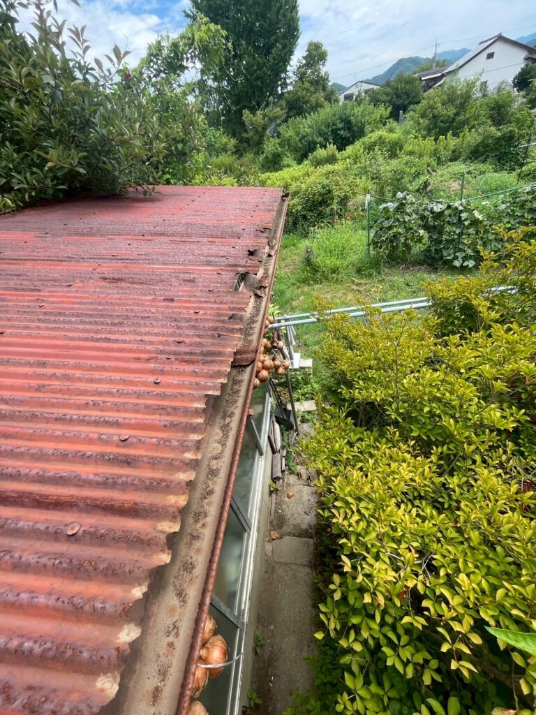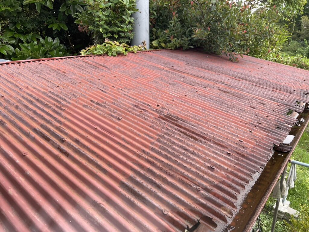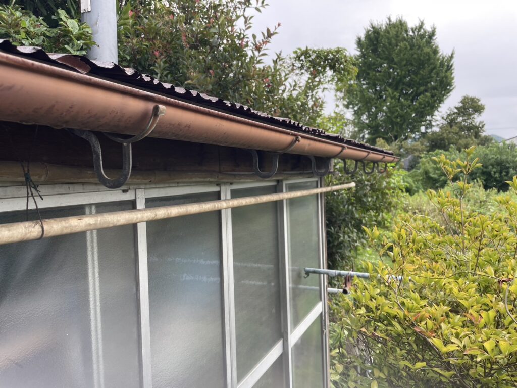 もともとお施主様のご家族が塗装されたという思い出のある屋根でしたが、長年の経年劣化によりトタン部分の錆びや塗膜の剥がれが進行。さらに雨樋も破損しており、雨水がうまく排水されず、物置内にも影響が出ている状態でした。