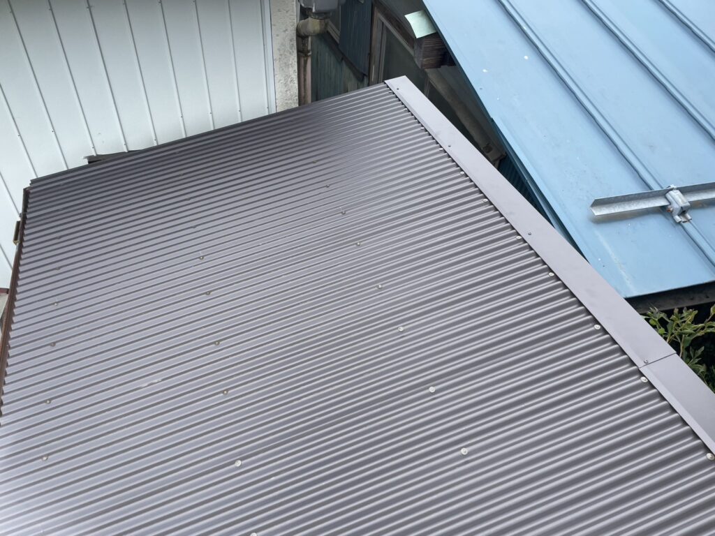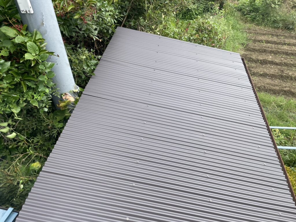 屋根材として使用したのは、軽量かつ耐久性に優れたガルバリウム鋼板。錆びにくく、長期間美観を保てる素材のため、物置のように年中雨風にさらされる場所にはぴったりです。工事はわずか1日で完了。通常であれば複数日かかる屋根工事も、カバー工法なら短期間で仕上げられるため、お客様のご負担も少なく済みます。