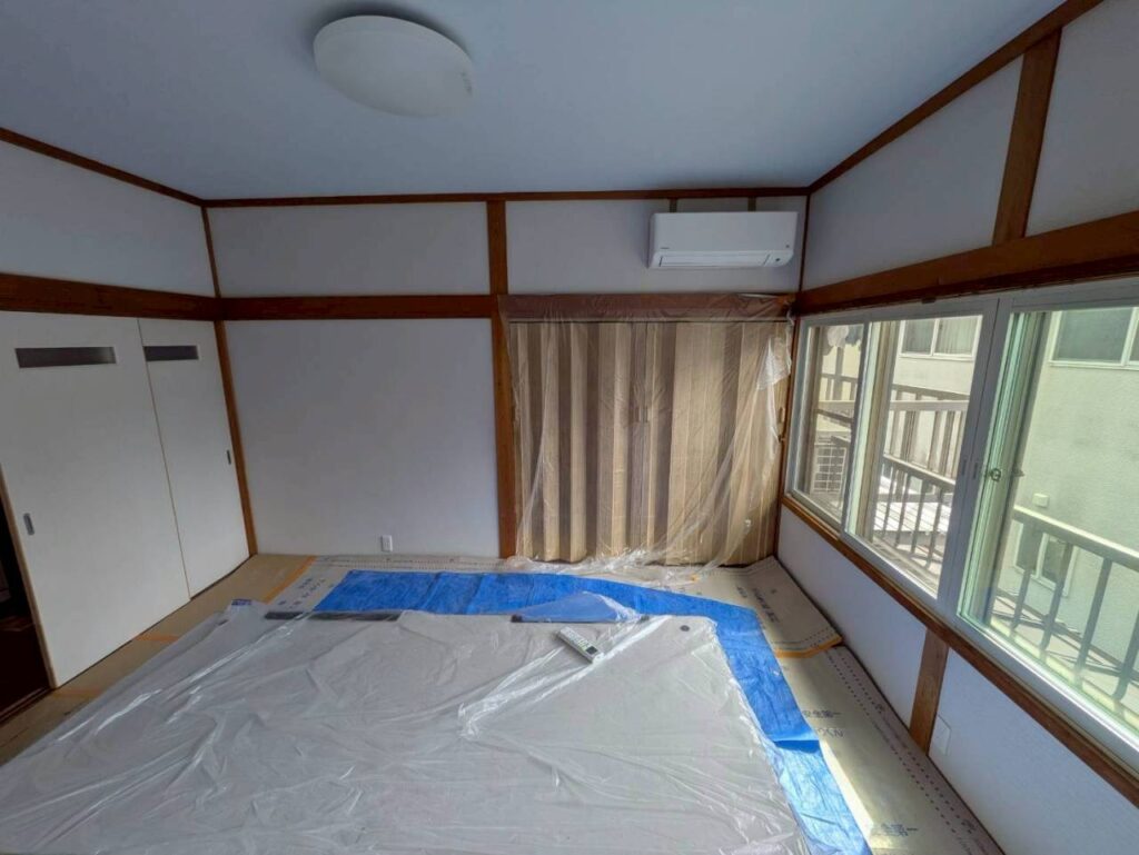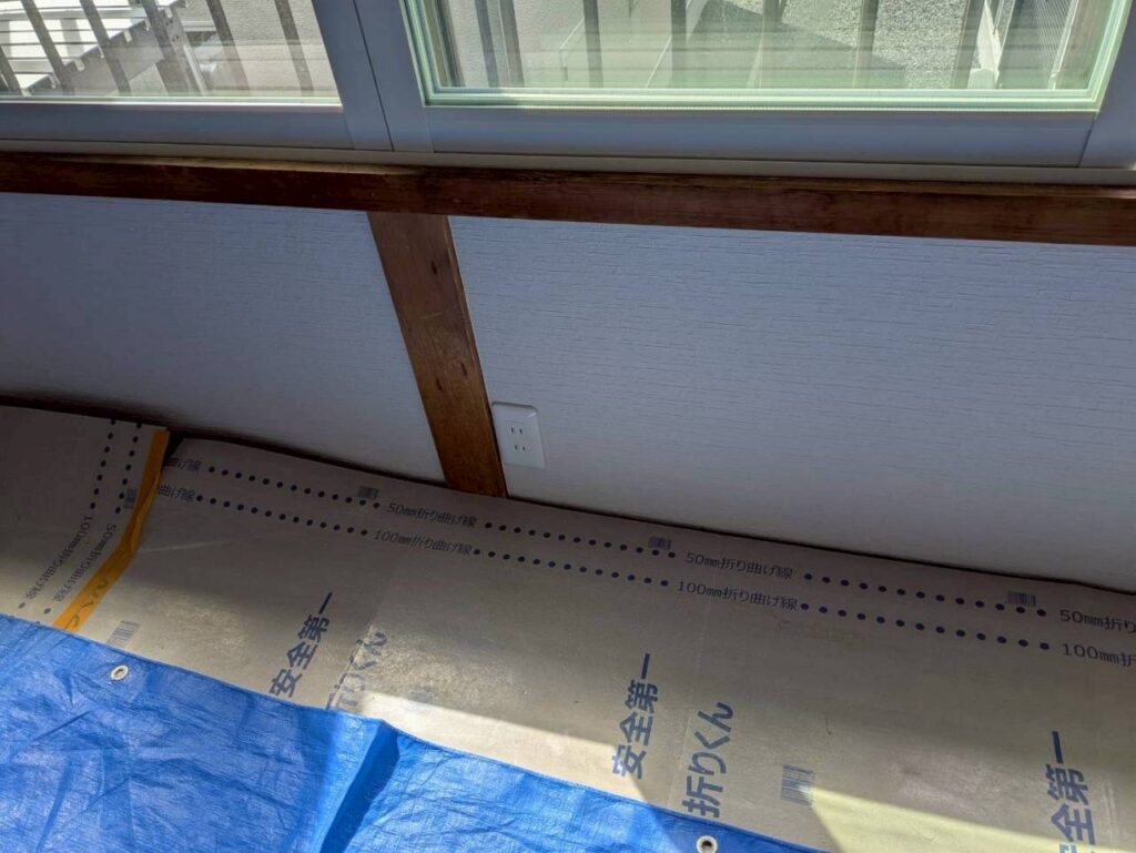 周囲の壁や窓にはビニールシートで養生を行い、クロス張りや木工事による汚れを防止。お部屋を傷つけないよう細心の注意を払っています。