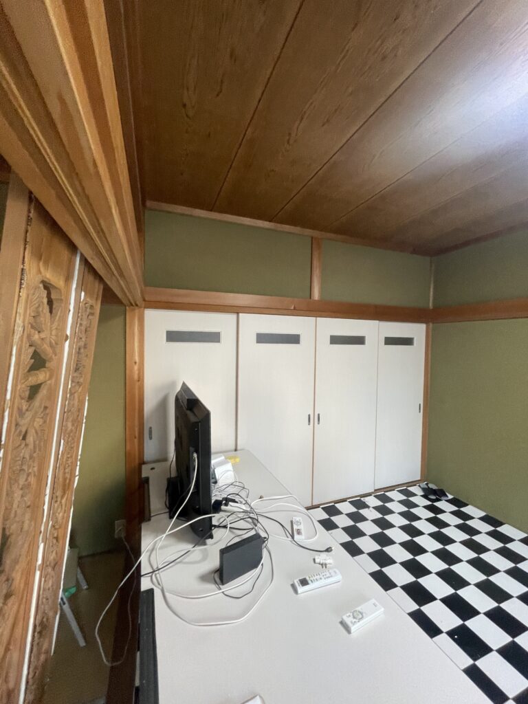 部分的に市松模様のクッションフロアが敷かれていました。クロス仕上げにすることで、和風から洋風の雰囲気に寄せていきます。