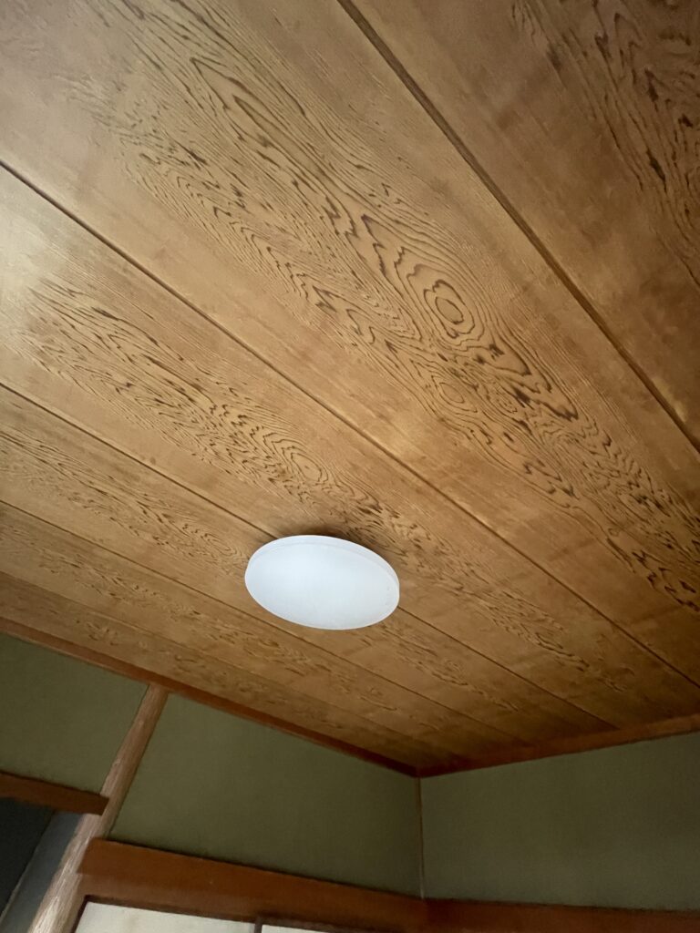 天井の木材も、経年による色あせやムラが見られ、空間全体が暗く感じられる印象に。明るさと統一感を出すため、天井もクロス仕上げを採用することに。
