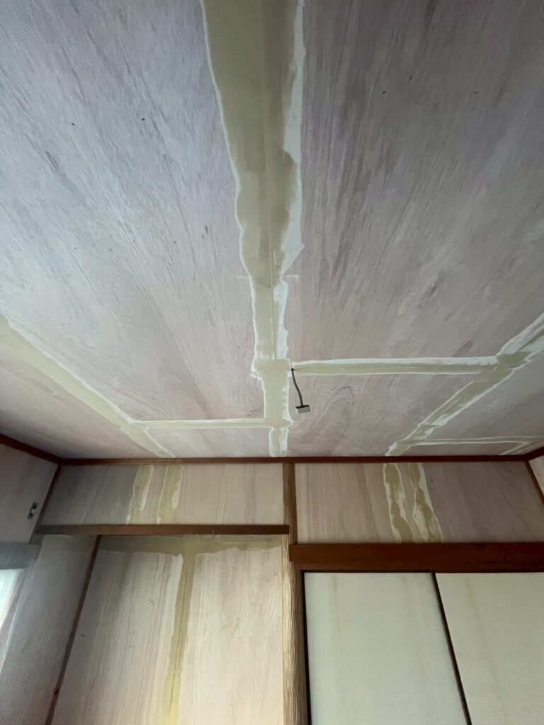 天井や壁のベニヤのジョイント部分にパテを入れて、滑らかに仕上げます。クロスを美しく張るための大切な下地作業です。