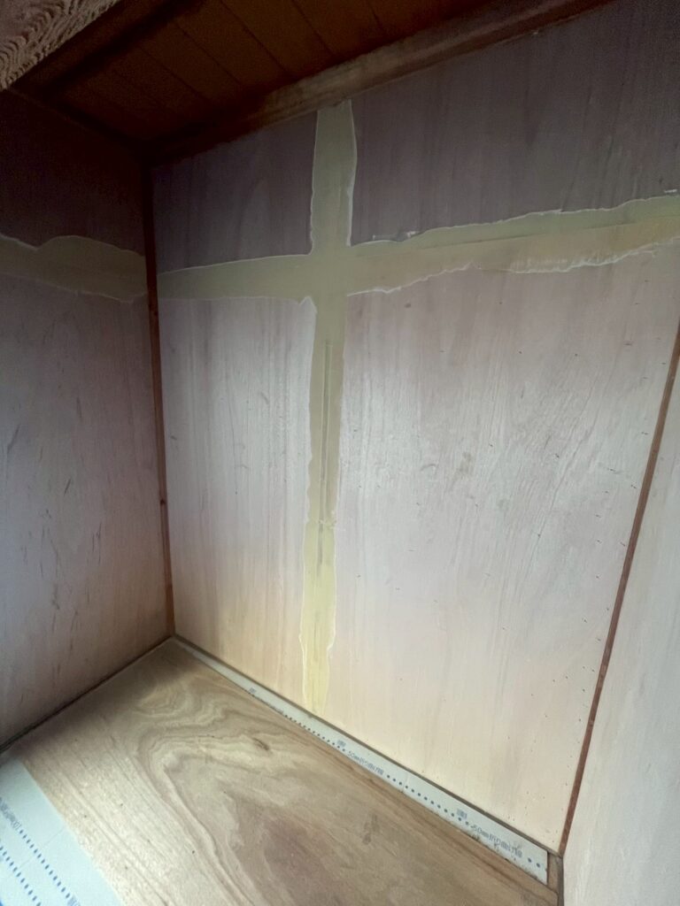 床の間の壁にも丁寧にベニヤ合板を貼り、継ぎ目にパテ処理を施しています。目に触れない場所も手を抜かず、美しい仕上がりを追求しています。
