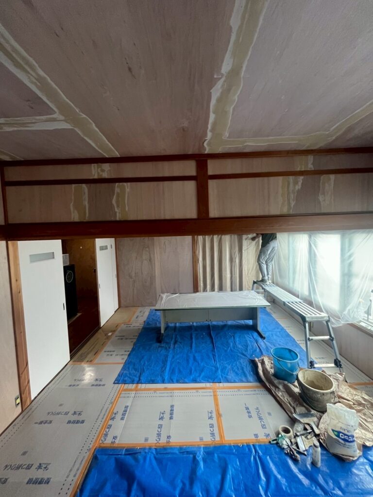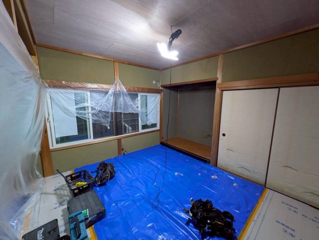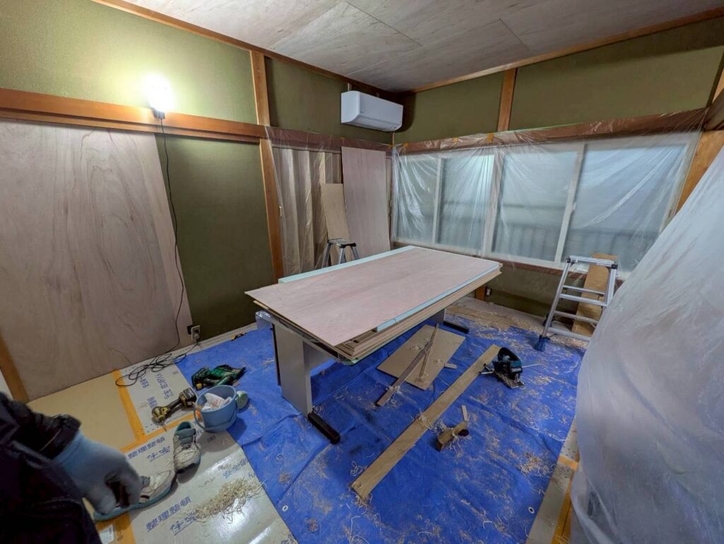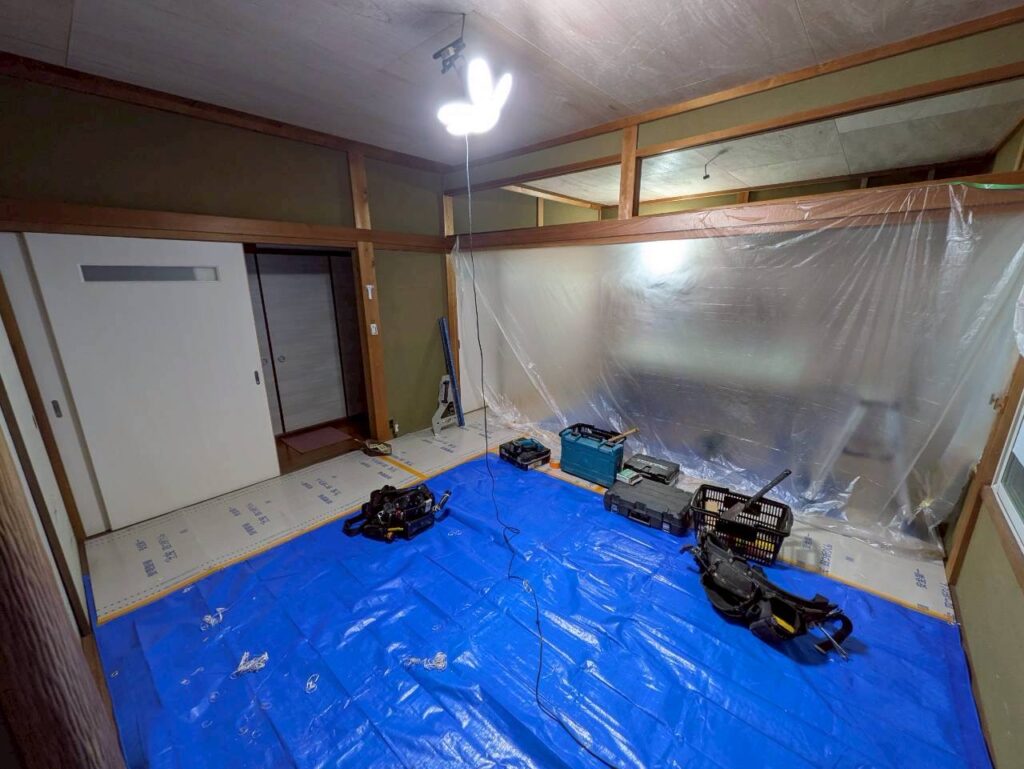 畳を傷つけないよう、ブルーシートと養生ボードで二重に保護。作業台や道具も整然と配置し、安心・安全な作業環境を確保しています。