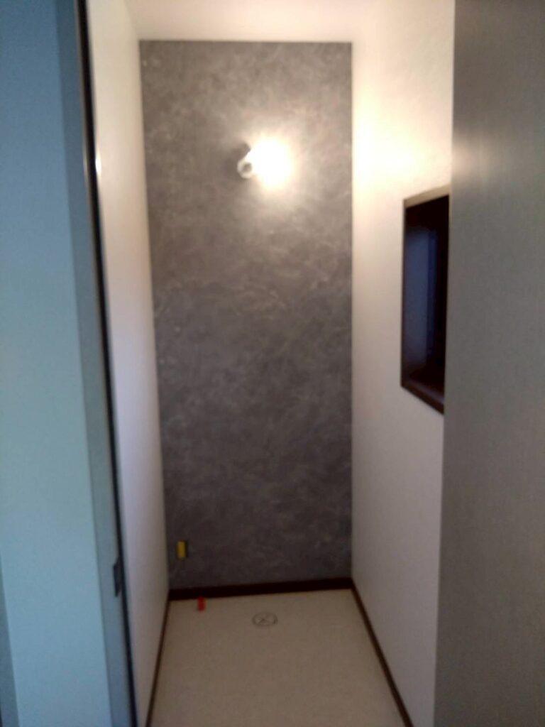 クロスと床の張り替えが完了した状態です。アクセントクロスを取り入れることで、スタイリッシュなトイレ空間に生まれ変わります。
