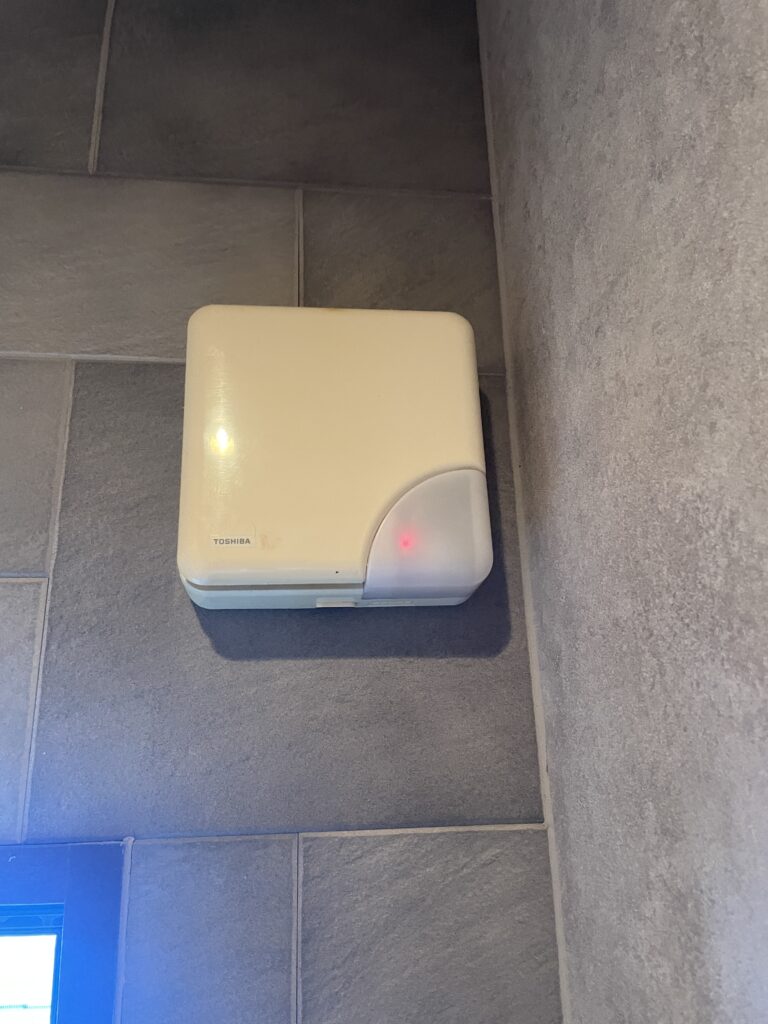 トイレの換気扇を交換している様子です。内装を新しくするタイミングで換気扇も入れ替えることで、見た目だけでなく換気性能やお手入れのしやすさも向上します。
