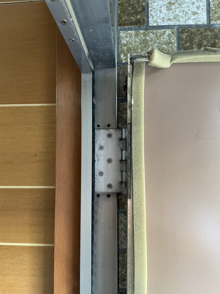 長年使用されてきた玄関ドアの蝶番部分です。可動部の摩耗や汚れが進み、ドア全体の動きや建付けに影響が出ていました。