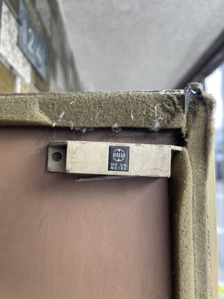 施工前のドア枠と受け金具の様子です。金属部分には錆が見られ、鍵がスムーズにかからない原因のひとつとなっていました。