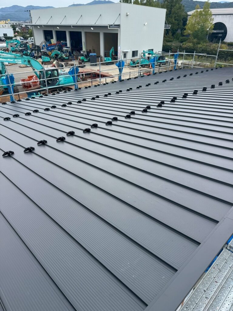屋根材(ガルバリウム鋼板)の施工が進み、外観の印象が整ってきました。耐久性と防水性に配慮しながら、丁寧に仕上げています。