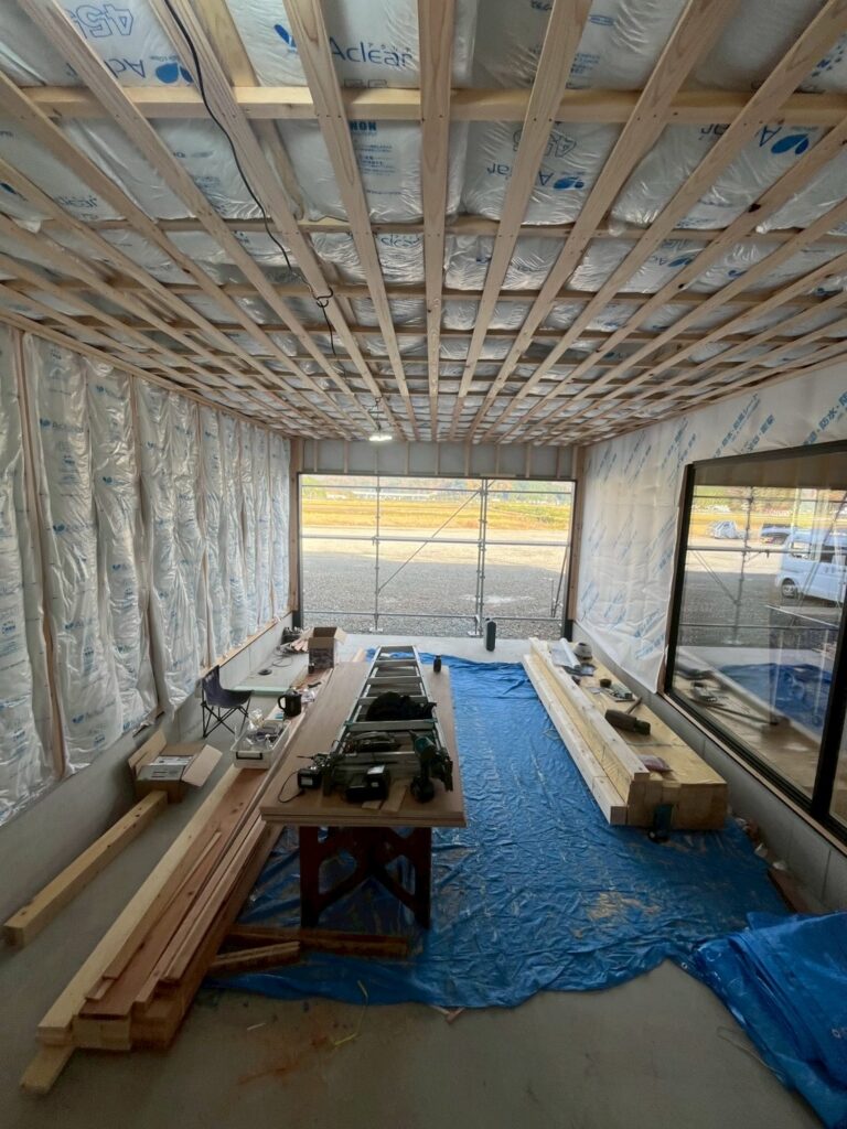 壁・天井に断熱材を施工し、室内環境の下地を整えています。見えなくなる部分こそしっかり施工することで、快適性を高めていきます。