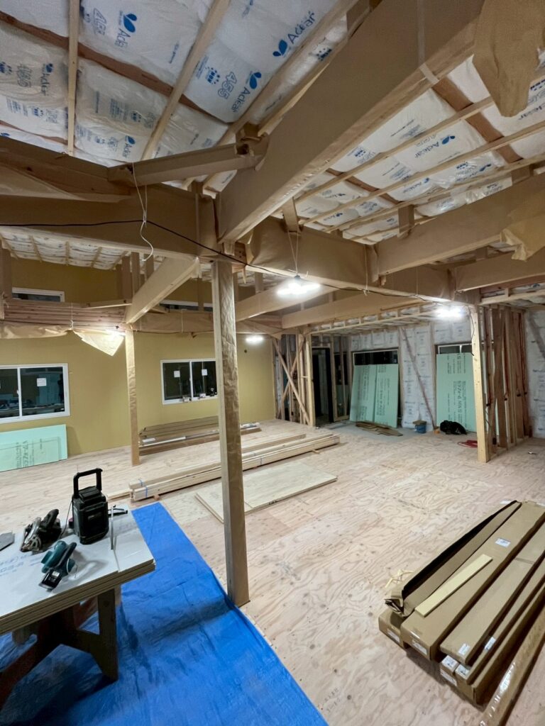 床下地の施工が進み、室内の空間構成が見えてきました。柱や梁を活かした設計で、完成後の開放感がイメージできる段階です。