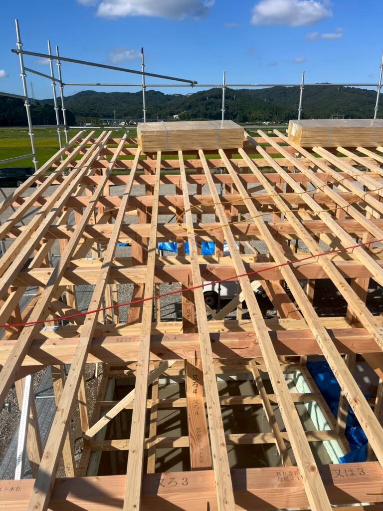 柱や梁が組み上がり、建物の骨組みが一気に形になりました。屋根の下地も施工され、空間の広がりが感じられる段階です。