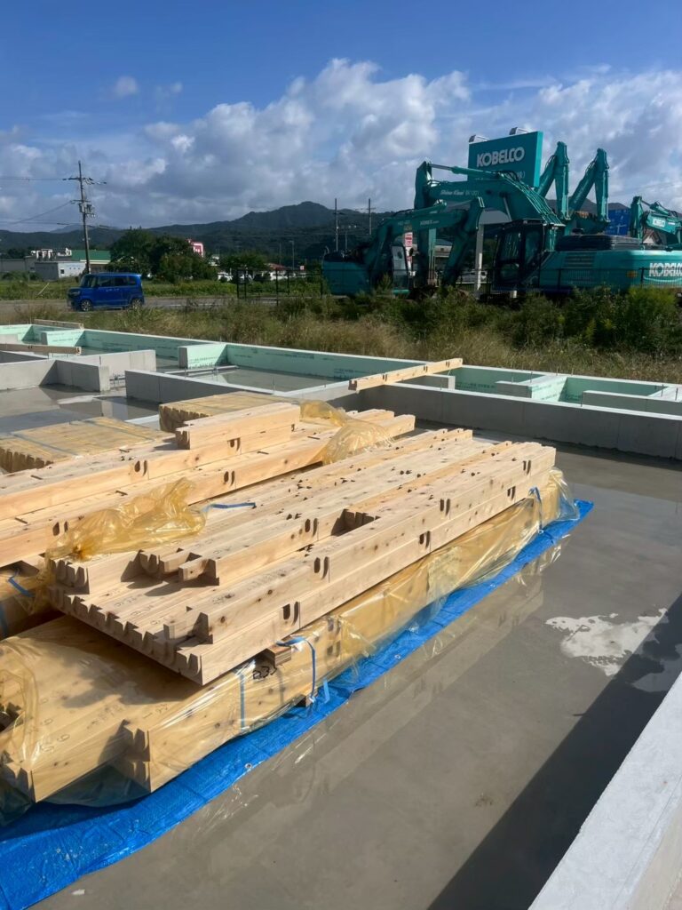上棟に向けて、梁や柱となる構造材の搬入を行いました。プレカットされた木材を現場で組み上げていく準備が整っています。