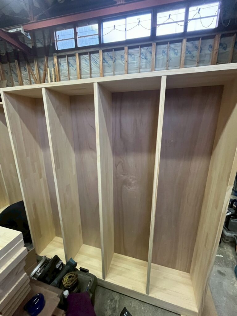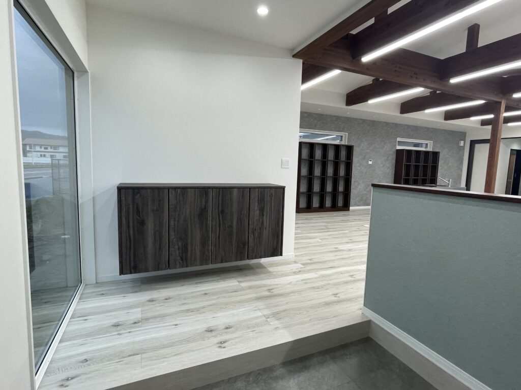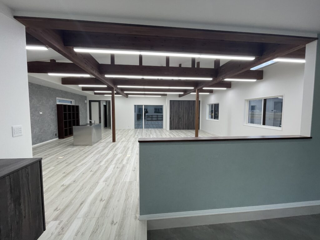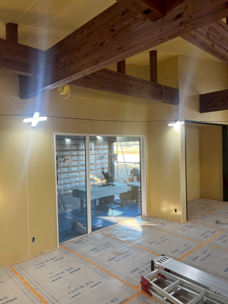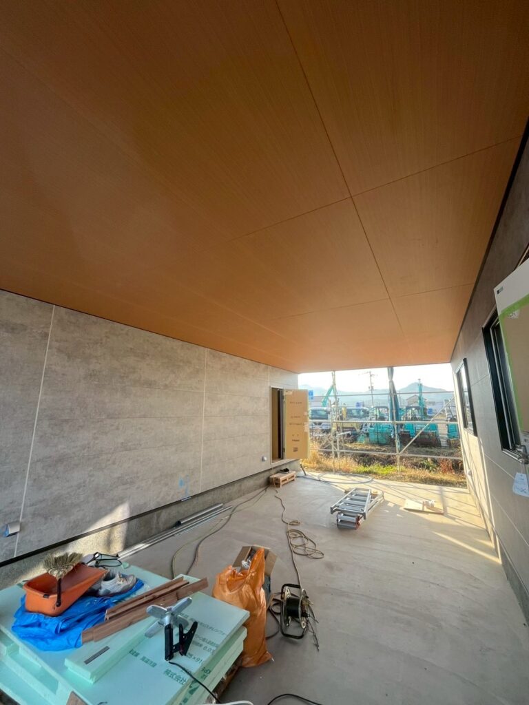 軒下空間の仕上げが進み、外と内をつなぐ多目的スペースが形になってきました。天井や壁材の質感にもこだわり、心地よい空間を作っています。