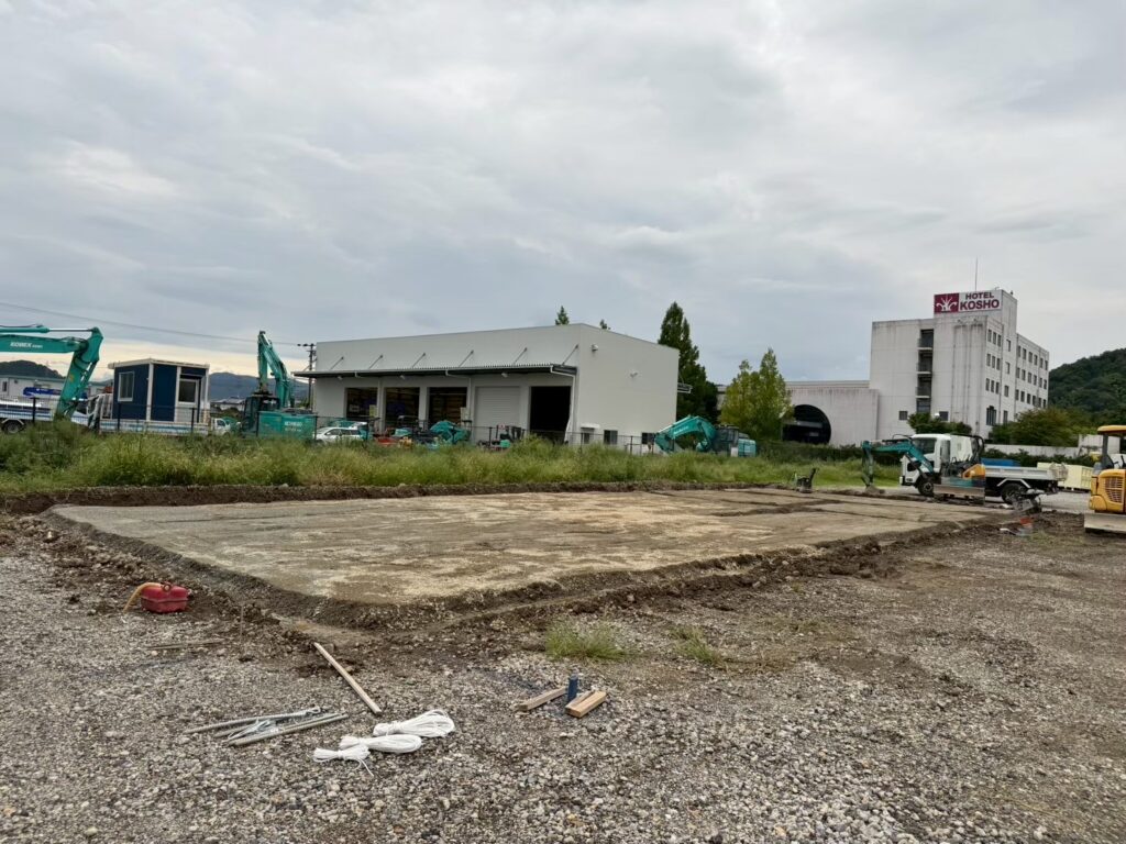 建物の基礎工事に向けた、敷地の整地作業です。建物配置に合わせて地盤を整え、これからの工事の土台づくりを進めていきます。