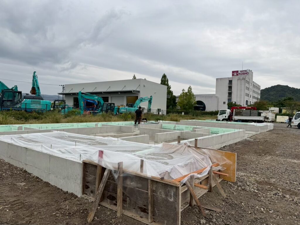 基礎の立ち上がり部分まで施工が進み、建物の輪郭が見えてきました。