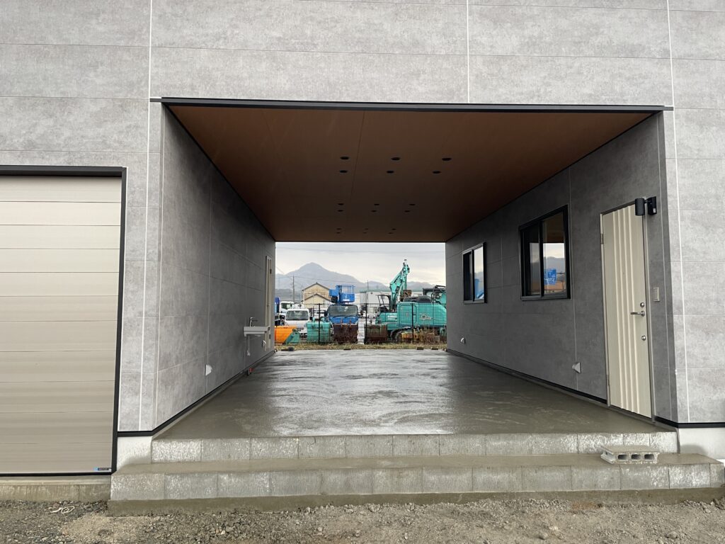 ガレージには、開閉がスムーズで見た目もスタイリッシュなオーバースライダーシャッターを採用。ハニカムライトの照明や、建物の間に設けた多目的スペースなど、機能性とデザイン性の両立にもこだわりました。イメージしたのは〝働くための場でありながら、使い方に広がりのある、ゆとりを感じられる拠点〟です。