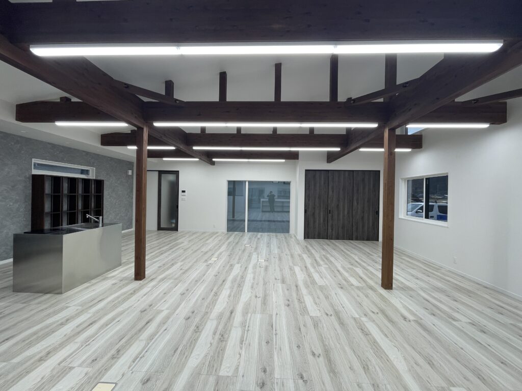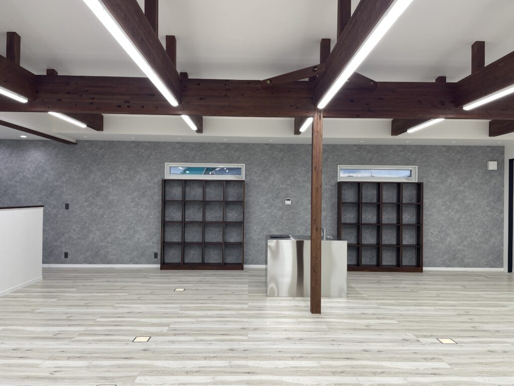 無垢調の床と木の梁を活かした天井デザイン。広々としたワンフロア設計で、作業や打ち合わせなど多用途に対応可能です。