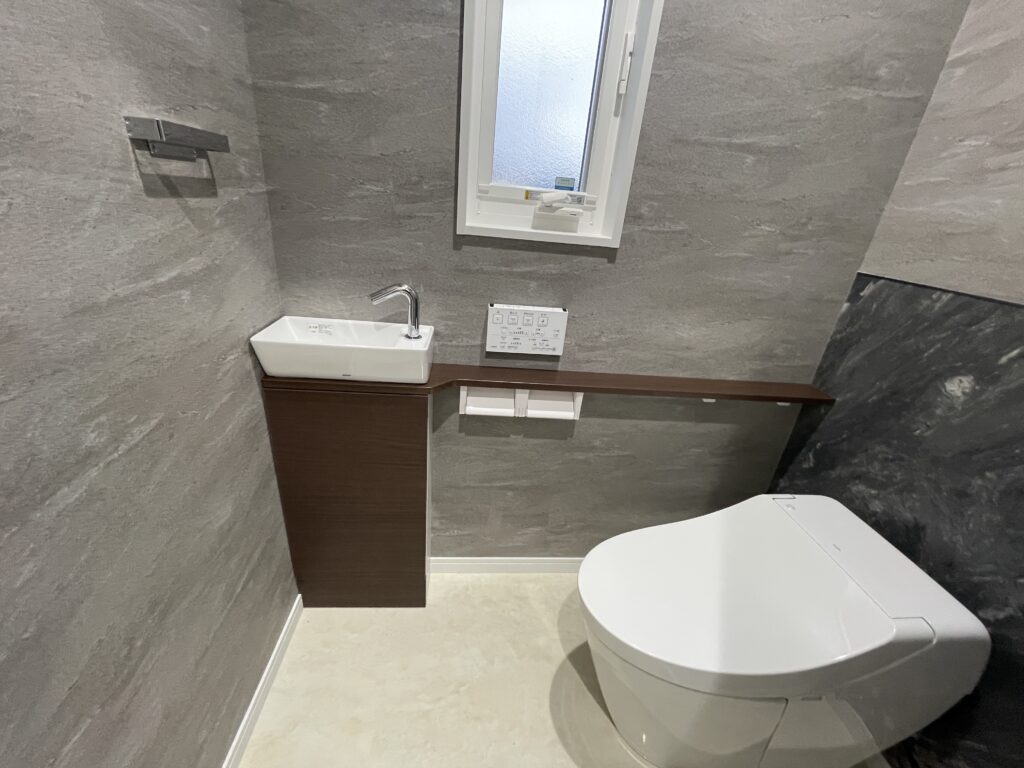 シンプルで落ち着いた色合いの内装に、コンパクトな手洗い器を組み合わせた使いやすいトイレ空間です。日々の使い勝手にも配慮しています。
