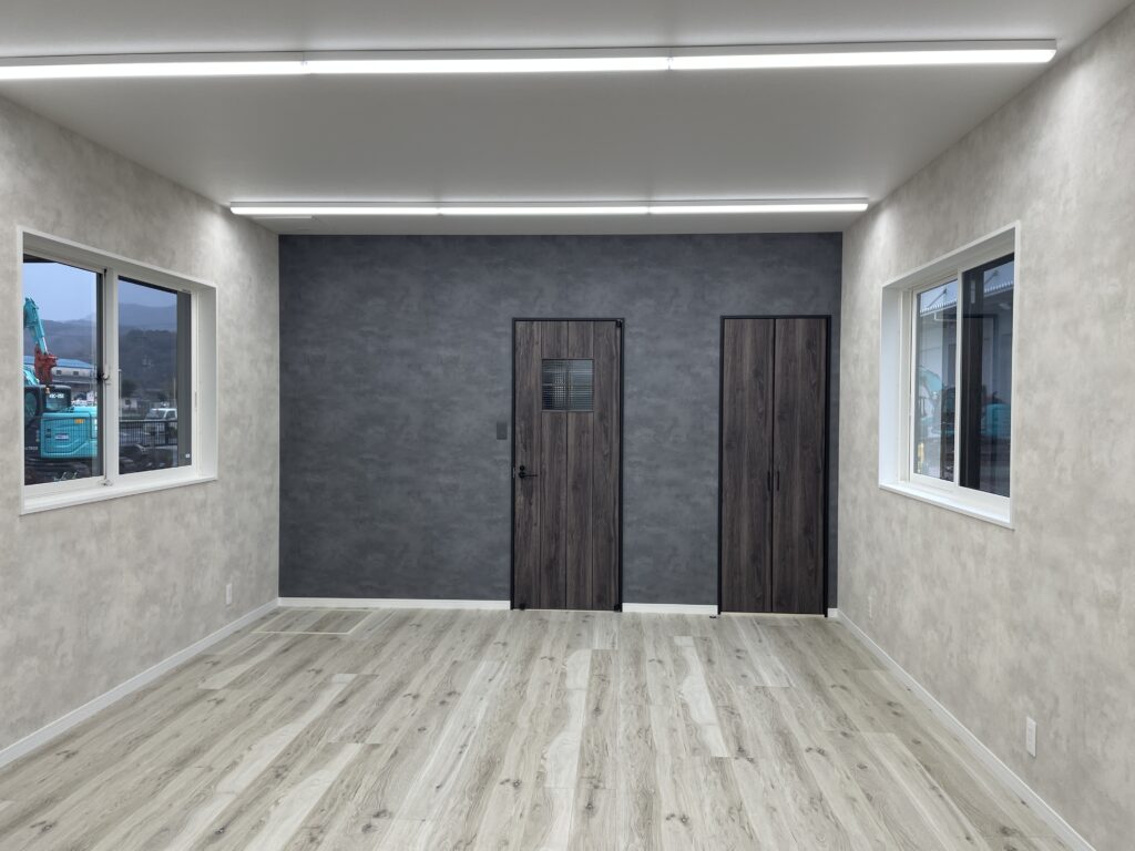 完成した建物は、従来の約2倍の広さとなり、事務所スペース・休憩スペース・ガレージをバランスよく配置。業務効率と働きやすさの向上を実現しました。また、外作業の多い業種に配慮し、シャワールームの設置もご提案しています。