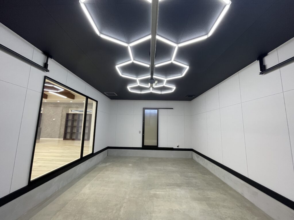 ガレージ内の照明には、印象的なハニカムライトを取り入れ、実用性とデザイン性を兼ね備えた空間を演出しています。