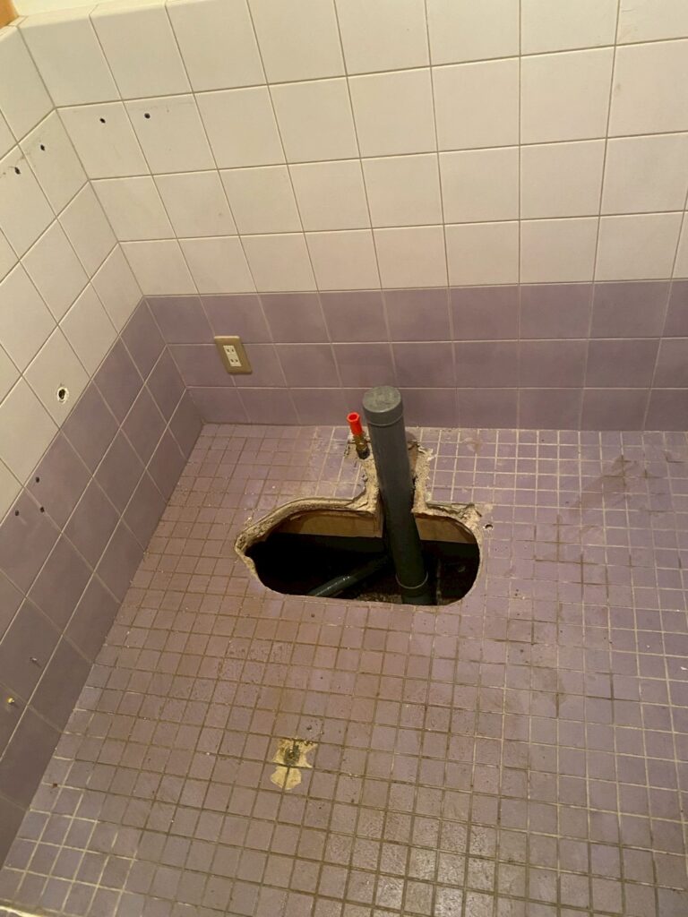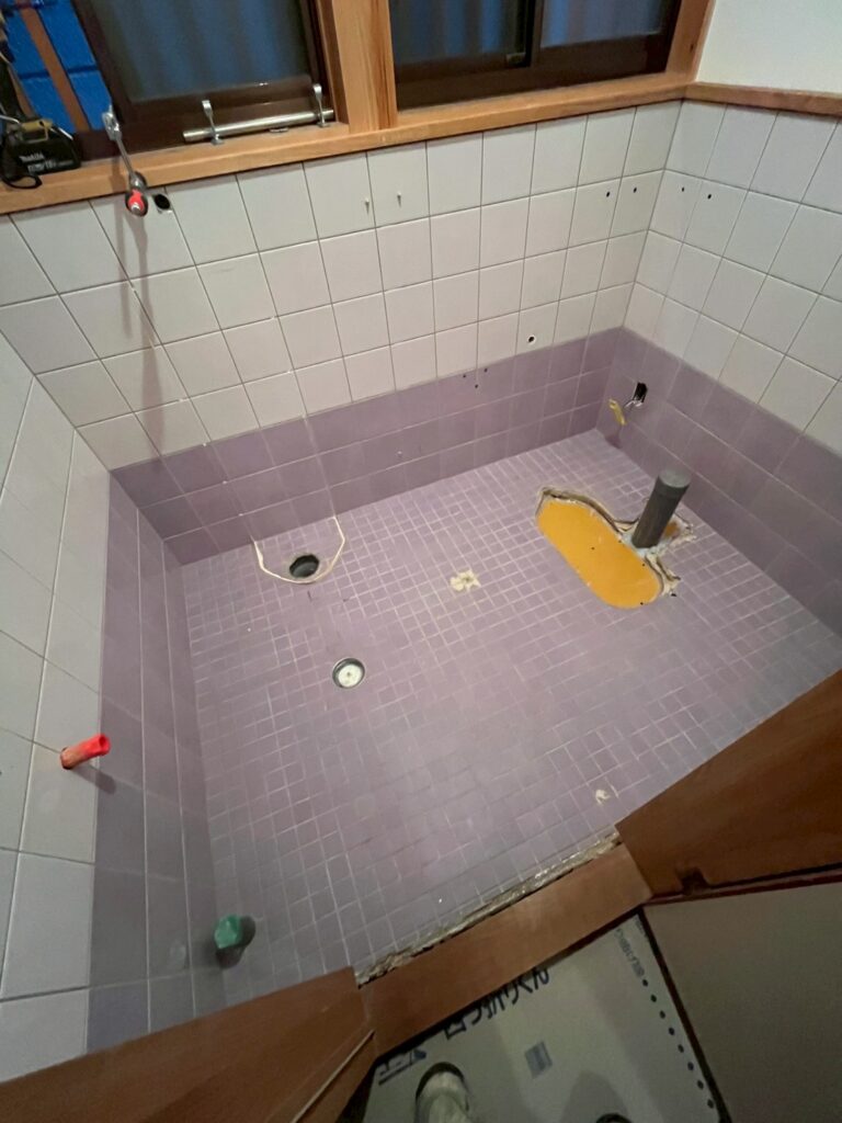 今回は、内装をタイルからフローリングへと変更。その際、出入り口の段差を解消し、安全にご使用いただける空間づくりを目指します。