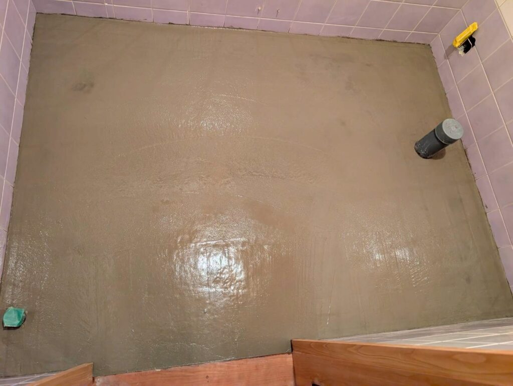 既存のタイル床の上から下地調整を行います。段差を解消しながらしっかりと下地を整えることが、美しい仕上がりに繋がります。